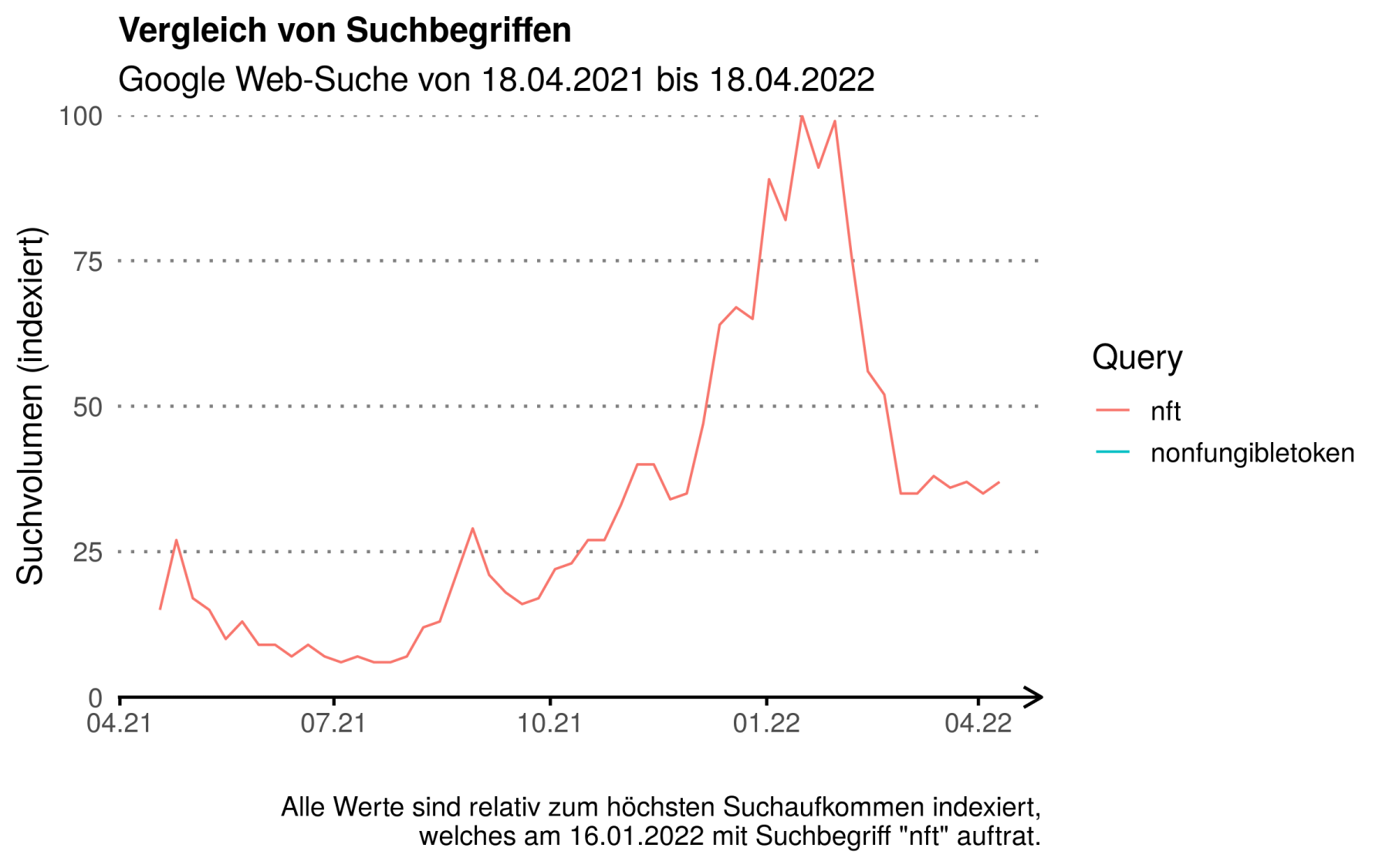 Die US-amerikanische Comedy-Show Saturday Night Live veröffentlichte im März 2021 eine starbesetzte Song-Parodie von Eminems Hit „Without Me“. „What the hell’s an NFT?“ erklingt im Refrain des mittlerweile über 5 Mio. mal geklickten Sketches – eine Frage, die sich in den vergangenen 12 Monaten einige Menschen gestellt haben dürften. Anfang 2022 erreichen die Google Suchen zu „NFT“ – wie in der Abbildung oben zu sehen - ihren Höhepunkt und die drei Buchstaben sind plötzlich in aller Munde, naja zumindest in „vieler“ Munde.