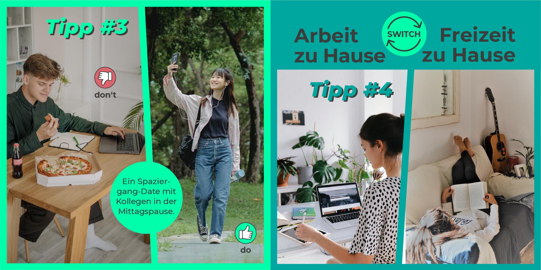 Auf das eigene Mindset achten: Auch wenn man von zu Hause arbeitet, kann eine innere Einstellung helfen, in den Arbeitsmodus zu kommen. Sich also bewusst zu machen „jetzt ist Arbeitszeit und ich bin bei der Arbeit“ kann den Wechsel von Arbeit zu Hause vs. Freizeit zu Hause vereinfachen. Das bedeutet auch, dass man beispielsweise mit privaten Anrufen oder anderen privaten Tätigkeiten ebenso umgeht, als wäre man im Büro. Umgekehrt heißt das aber auch, dass nach Feierabend keine Zeit mehr für Arbeitstätigkeiten genutzt wird, ganz so als hätte man das Büro verlassen.