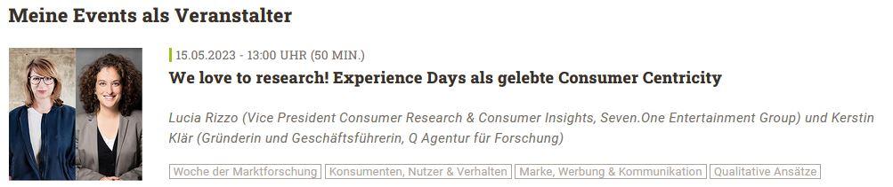 Ganz unvoreingenommen sind wir natürlich nicht und deswegen war für uns das Webinar „We love to research! Experience Days als gelebte Consumer Centricity“ von Lucia Rizzo (Vice President Consumer Research & Consumer Insights, Seven.One Entertainment Group) und Kerstin Klär (Gründerin und Geschäftsführerin, Q Agentur für Forschung) sicherlich das große Highlight.