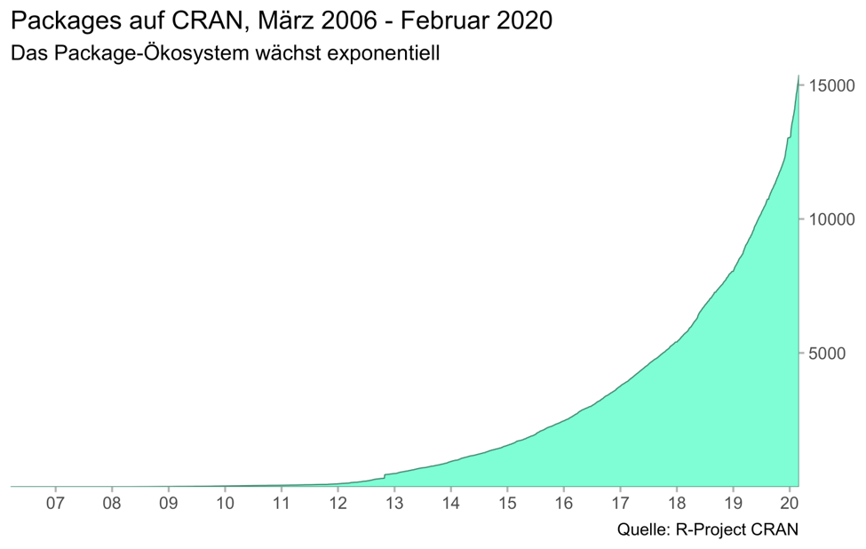 Auch 2020 beginnt R stark — die Programmiersprache wird stetig weiterentwickelt und bleibt doch ihren Wurzeln treu. Während das R Core Team auf die Stabilität von Base-R bedacht ist, entwickelt sich die Sprache mit Packages immer weiter. Sie erweitern R in alle möglichen Richtungen: neue statistische Modelle, neue Visualisierungen, neue Anbindungen an APIs und Datenbanken, neue Reportingformate.