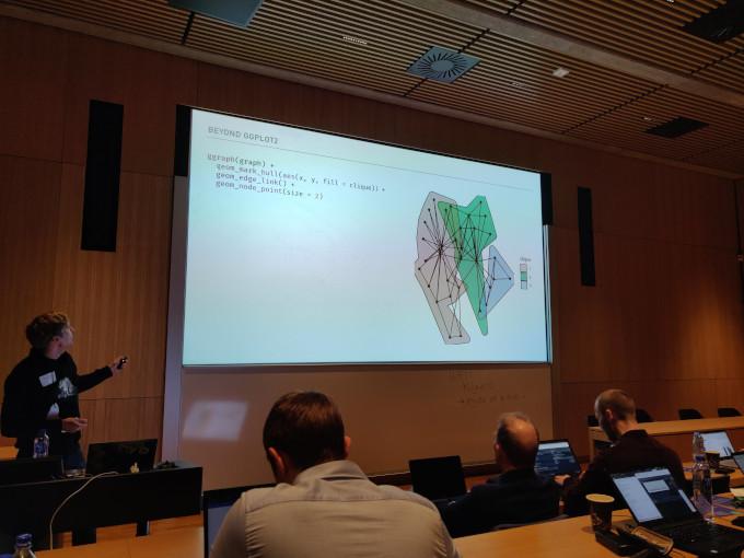 Thomas Lin Pedersen (Softwareentwickler bei RStudio) hielt einen Workshop zum Thema Datenvisualisierung mit ggplot2 (Slides). Dirk Eddelbuettel von der Universität Illinois referierte zu Rcpp, einem R Package, dass es erlaubt, C++ Code in R aufzurufen (Slides). Ich besuchte den ersten Workshop und konnte einiges über ggplot2 lernen. Mit Updates (bzw. Releases) der Packages ggforce, ggraph, gganimate und patchwork sind im vergangenen Jahr viele neue Funktionen dazu gekommen, die in unserer täglichen Arbeit bei Q von Nutzen sind. Das Schlüsselwort ist Storytelling: Mit neuen Annotationen und Animationen kann der Leser durch eine Datenanalyse geführt werden. Unter #tidytuesday auf Twitter lassen sich tausende von Beispielen finden.