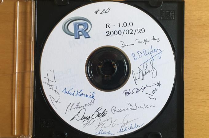 Die Eröffnung machte Peter Dalgaard, Mitglied des R Core Teams. Er zeigte ein echtes Artefakt: Die CD mit der ersten Version von R. Außerdem führte er live den Release der neuesten R Version 3.6.3 durch.